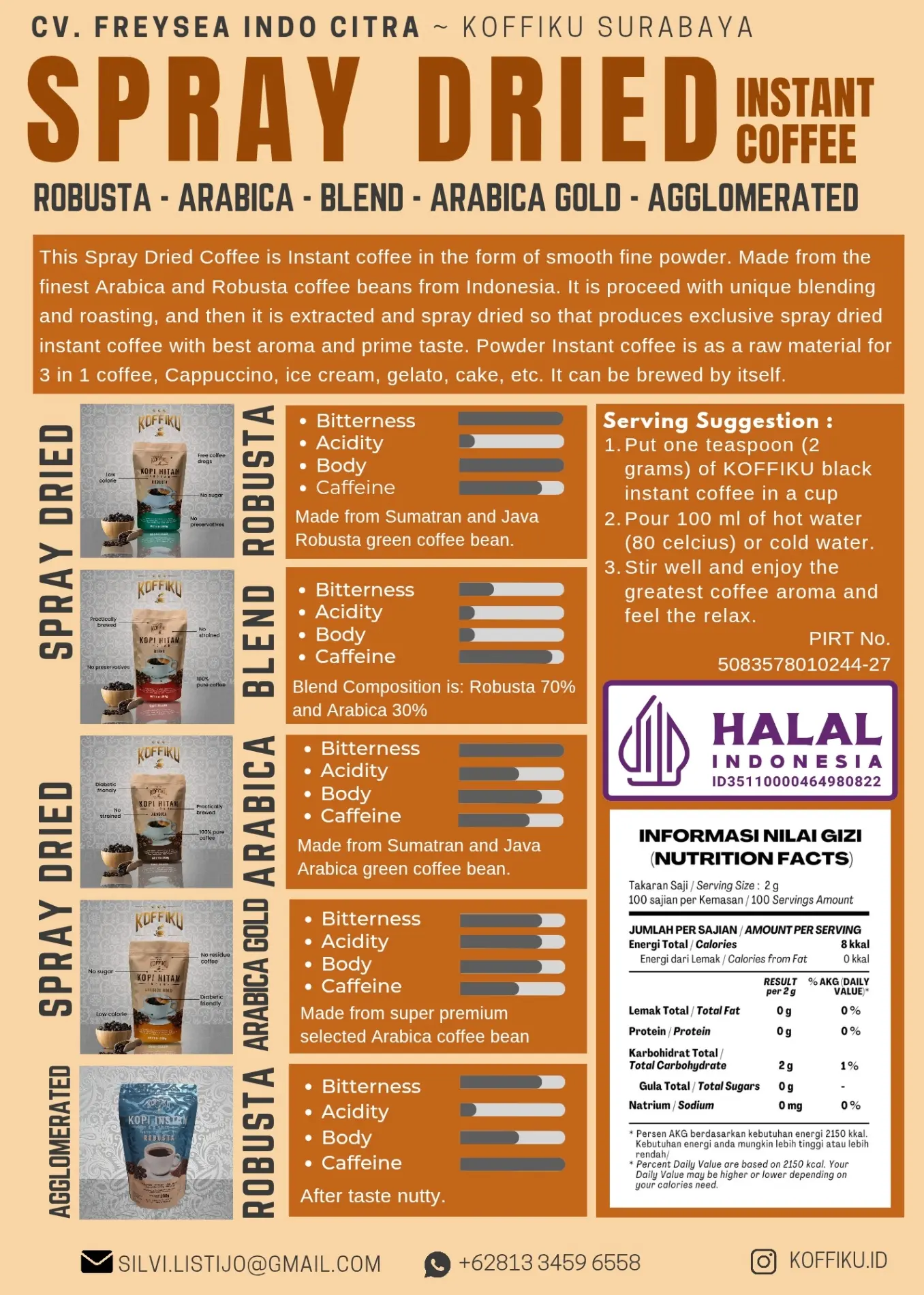 CV. Freysea Indo Citra is an instant coffee manufacturer which brand is KOFFIKU. We established in 2018 and currently strengthen by 7 staffs. We are located in West Surabaya. We provide Instant Coffee such as Black Coffee (Robusta, Blend, Arabica, Arabica Gold) and produce 3 in 1 coffee, 2 in 1 coffee, Cappuccino, Latte in sachet form or in bulk quantity. Our legality is NIB, PIRT, Halal Certificate, and brand registered.